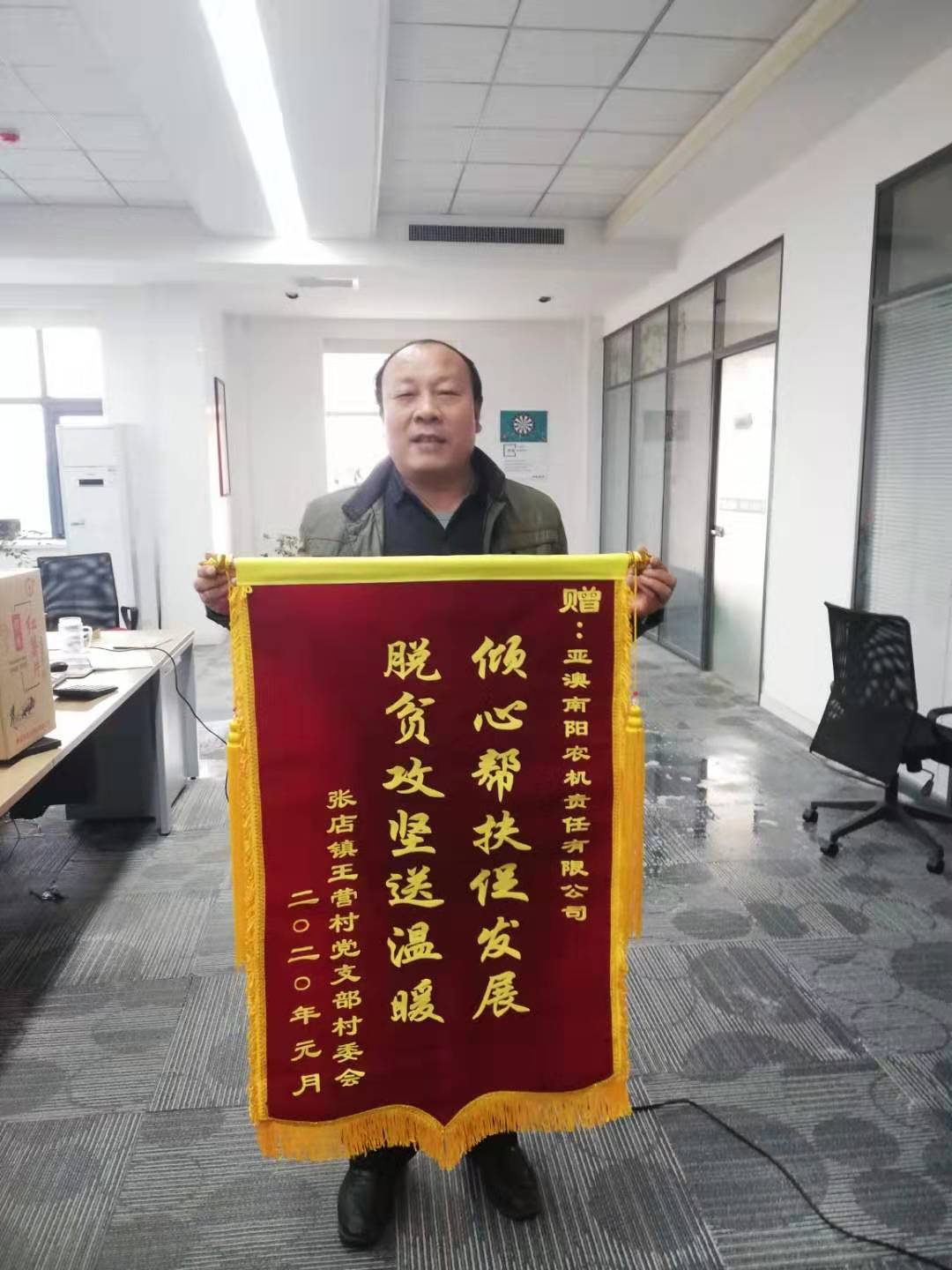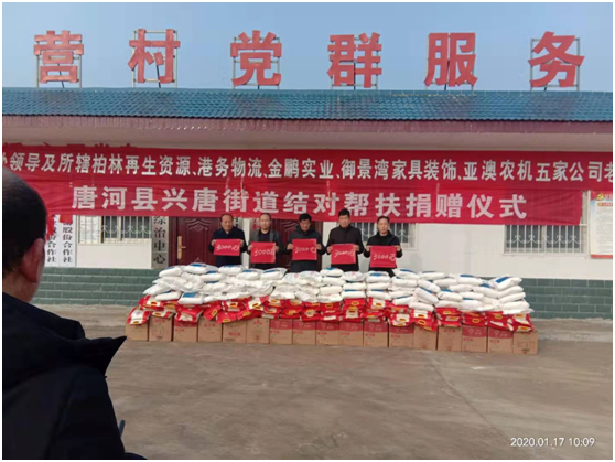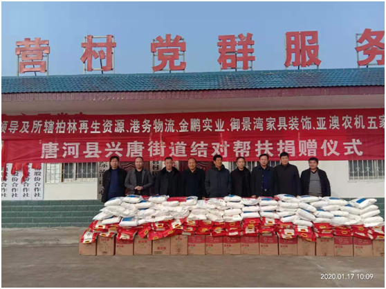 捐贈儀式上產業集聚區黨委書記劉清文、主任李國營代表興唐街道黨委、政府向五家企業的義舉表示感謝。他指出,以亞澳農機為首的這五家公司,在完成自身企業負責包片貧困村脫貧的基礎上,還能再拿出現金3000元捐資扶貧,將自己的社會責任意識,由助力脫貧攻堅,走向現在回饋社會。代表著我縣企業經營由起步走向成熟。他希望廣大困難群眾正確面對暫時的困難,樹立戰勝貧困、走出困境的信心和勇氣,發揚自力更生、艱苦奮斗的精神,不等不靠,在黨委、政府和社會各界的支持和幫助下,以自身的努力和實干來化解生產、生活中的各種困難,為構建美麗和諧的新唐河作出自己的貢獻。
