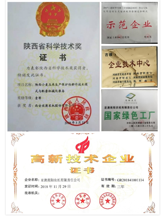 亞澳農機堅持“產品就是人品、內在是我心、外在是我臉”的品質原則,多功能變速旋耕機、旋播施肥機、聯合耕整機、雙軸滅茬機、精量免耕播種機、深松機等產品在耕整機械(主機配套40-300馬力)領域處于行業前列, 累計取得自主專利78項。2018年“亞澳”商標獲得中國馳名商標,產品多次被中國農機化協會、中國農業機械流通協會、中國農業機械工業協會授予“AAA級信用企業”、“技術進步獎”、“產品創新獎”、“全國農機用戶滿意品牌”、“最具影響力品牌”,被國家相關部委單位授予農業部科技進步三等獎、星火計劃金獎、西安市科技進步一等獎、陜西省行業之星企業,“專精特新”中小企業,南陽市級科技百強企業等多項殊榮;國家型高新技術企業,在農機行業中具有較高的美譽和知名度,得到了社會的廣泛認可。