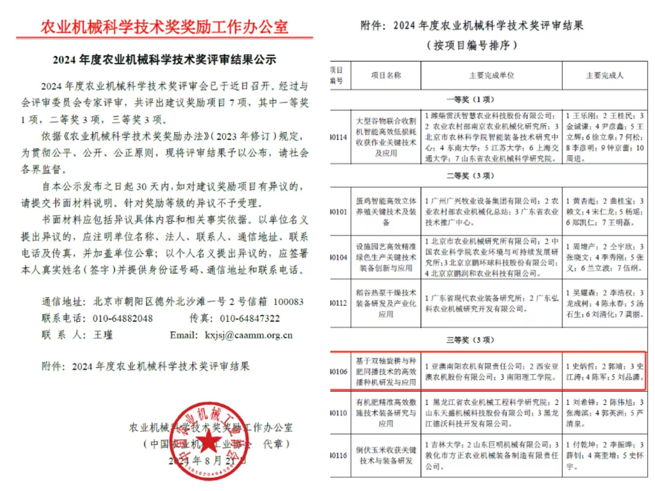 榮耀時刻:亞澳農機榮獲2024年度農業機械科學技術獎